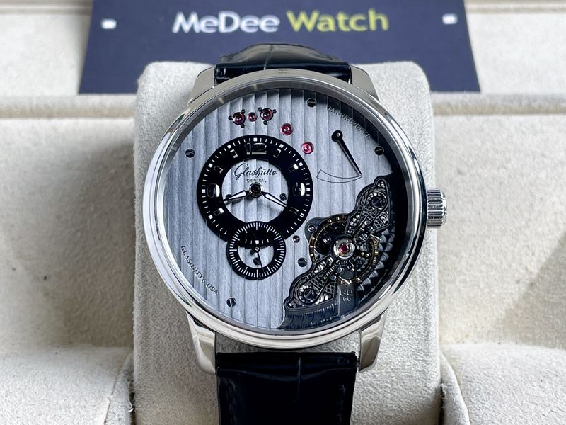 แบรนด์ไฮเอนด์จากฝั่งเยอรมัน คุณภาพงานชั้นสูง มาในตัวเรือนขนาด 42 หน้าปัดดีไซน์แบบ Off Center ลูกเล่นเจาะช่อง Open Heart โชว์กลไก แสดง Power Reserve บนหน้าปัด จัดวางมาอย่างลงตัว กลไกไขลาน มาพร้อมบัคเคิ้ลบานพับตรงรุ่นครับ