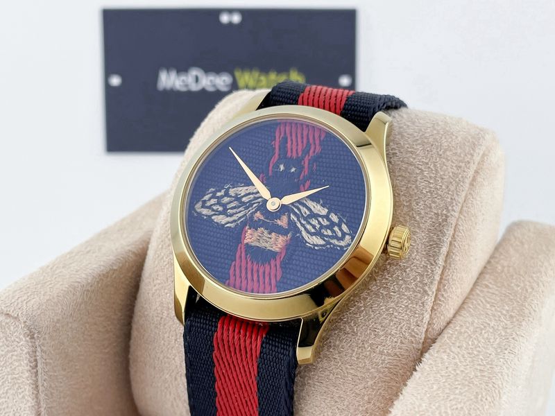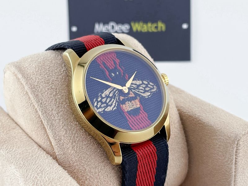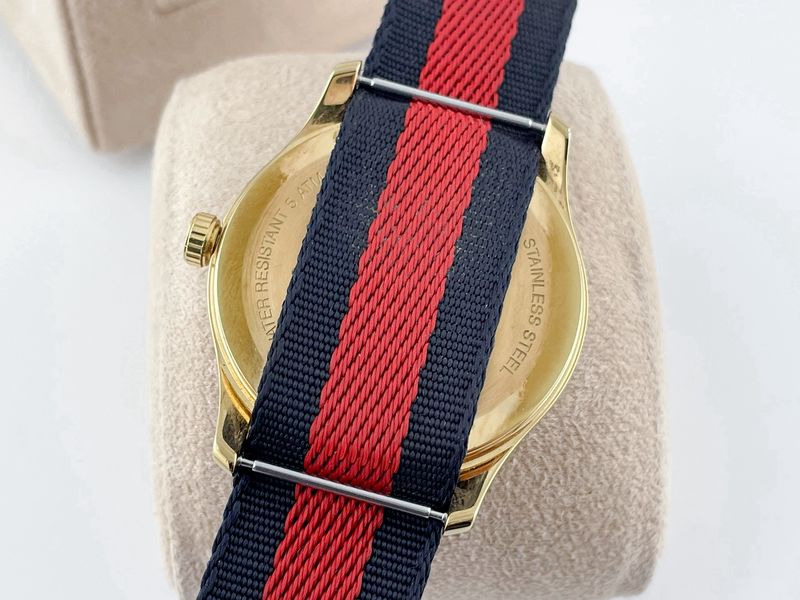 รุ่นฮิต หน้าปัดลายผึ้ง Signature ของแบรนด์ ตัวเรือนสีทอง ขนาด 38 ใส่ได้ทั้ง ช ญ สายผ้าลายสุดฮิสีน้ำเงิน แดง กระจกแซฟไฟร์ กลไก Swiss Quartz ออกช้อปราคากว่า 3x,xxx ครับ