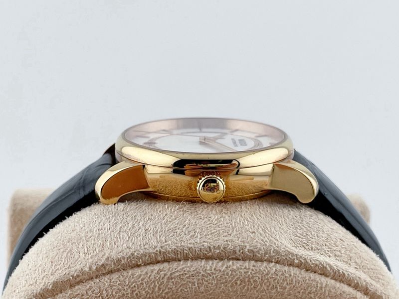 หน้าตาอย่างหรู ได้หน้ามุขแท้ Mother Of Pearl แบบปริซึ่ม เพชรแท้เดิม 51 เม็ด พร้อมใบเซอร์ ตัวเรือนสี Rose Gold ขนาด 33 มีช่องวันที่ เครื่องออโตเมติก หลังเปลือย สำรองพลังงานถึง 80 ชั่วโมง กล่องใบครบครับ ป้าย 43,xxx ครับ