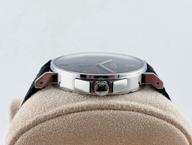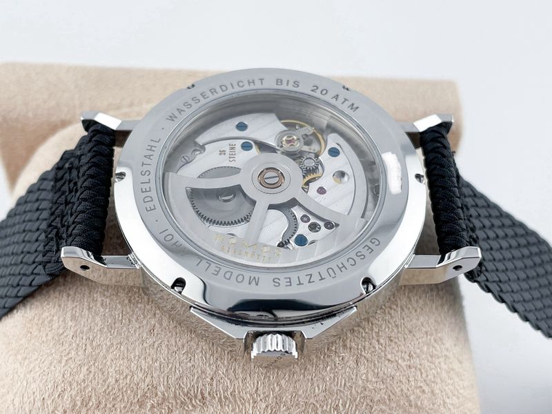 งานเยอรมัน เครื่องออโต้หลังเปลือย หน้าปัดดำ ตัวเรือนขนาด 43 เข็มวินาทีแบบแยกวง Sub Dial สาย Fabric ไนลอนสภาพสวยๆ กล่องใบครบ ใบไทย Pendullum ครับ