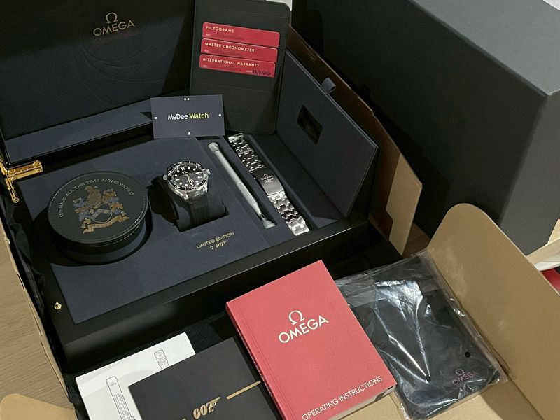 ของใหม่ ออกช้อปไทย เก็บนอนกล่อง เป็นรุ่นที่ฉลองครบรอบ 50 ปีของภาพยนต์ Oh Majesty’s Secret Service ที่เป็นตำนานของ James Bond โดยเรือนนี้ซ่อนความพิเศษ และรายละเอียดต่างๆ ไว้ได้อย่างสวยงาม ตัวเรือนขนาด 42 หน้าปัดดำแกะลายพิเศษเฉพาะรุ่น ชุดเข็มและหลักทองคำ 18K ขอบ Ceramic ด้านข้างแปะแผ่นทองคำสลักเลข Limited Edition หลังเปลือยโชว์กลไก Automatic พร้อมรายละเอียดพิเศษ มาแบบกล่องใบครบๆ และสายเหล็กใหม่อีกหนึ่งชุด แฟนๆห้ามพลาดเลยครับ