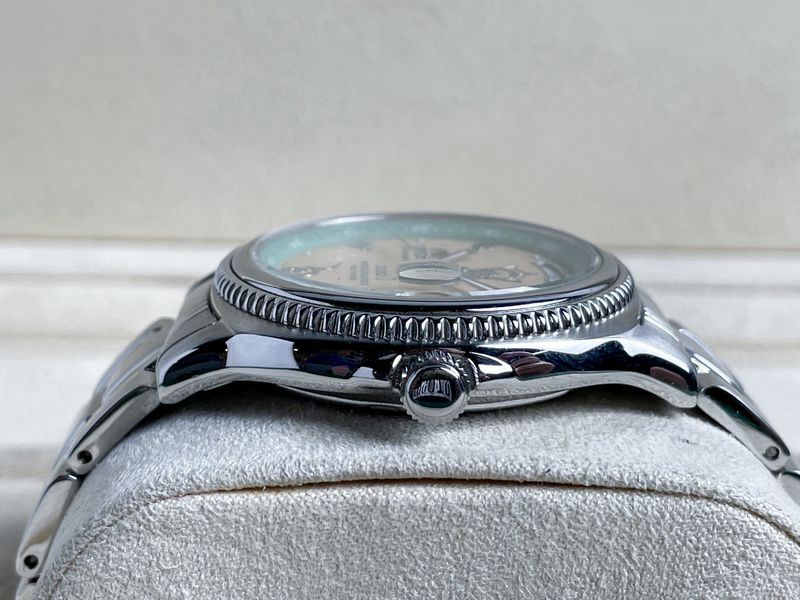 รุ่นเต็ด หายาก ทรงคุณค่า หลักเลขไทย และตราสัญลักษณ์ วันที่เลขไทย และบอกวันเป็นภาษาไทย หน้าปัดสีครีมลายไทย มาในตัวเรือนขนาด 36 เครื่องออโต้ ฝาหลังแกะลายพระราชวังและตีเลข ผลิดเพียง 490 เรือน กล่องใบครบครับ